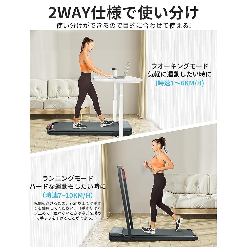 【こだわり細部のデザイン】女性一人で簡単に収納できます。前から横にかけて設置されたは手すり自分に合った握り方で使えます。パネル部にスマートフォンホルダーがあるので、音楽や動画を見ながら楽しくトレーニングができます。ウォーキングからジョギングまで目的にあったトレーニングを幅広くサポートします。自分のペースや目的にあわせて最適なスピードを選択できます。