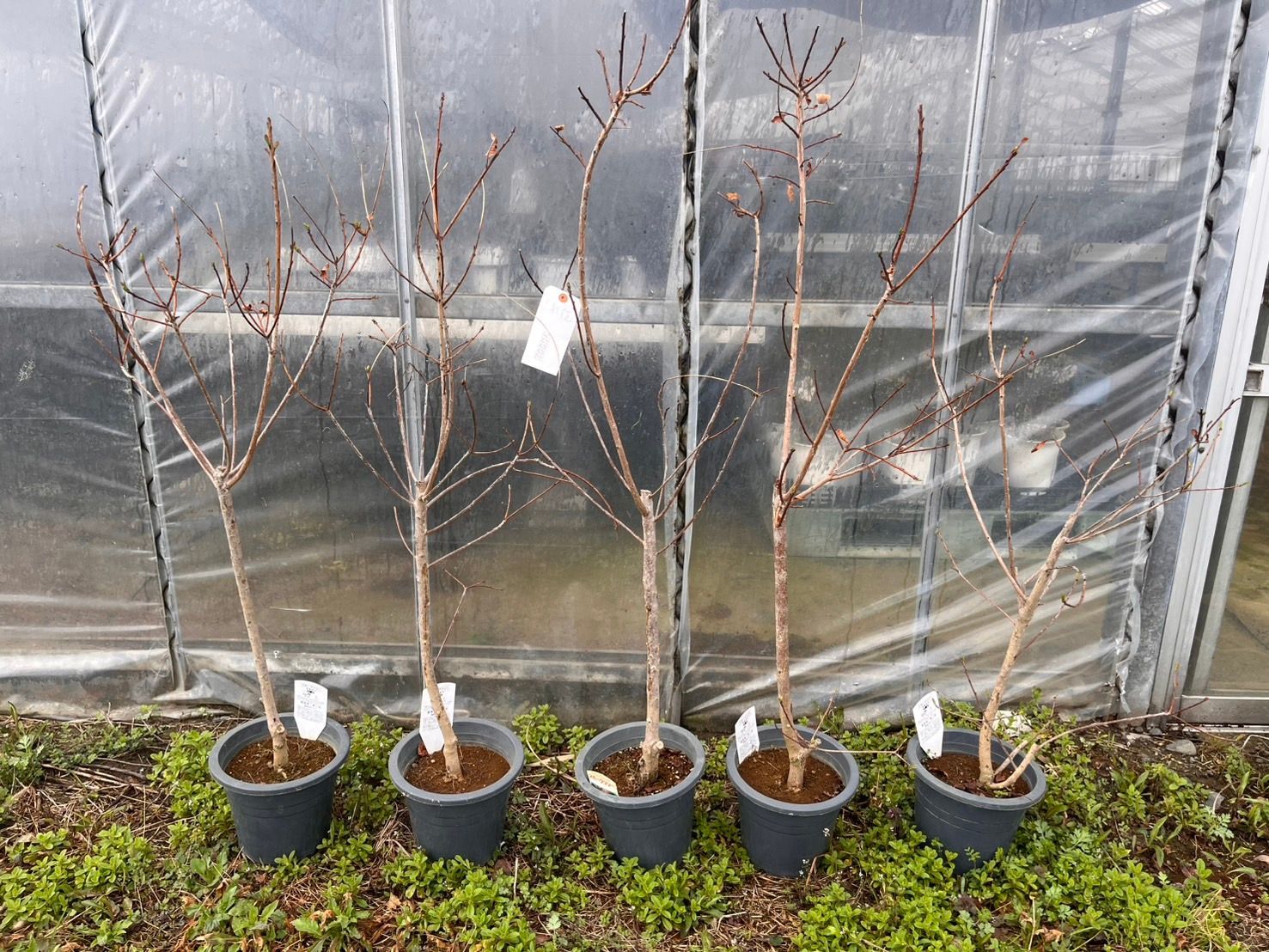 その4:特性上、高温期には頻繁に葉に斑点(炭そ病等)が出てしまいますが、秋には落葉して春には問題なく新しい葉が出てきますので、成育に問題はございません。気になる場合は葉を取り除いてください。また、葉の表面に白っぽい跡が見られる場合もございますが、消毒薬の跡ですのでご安心ください。