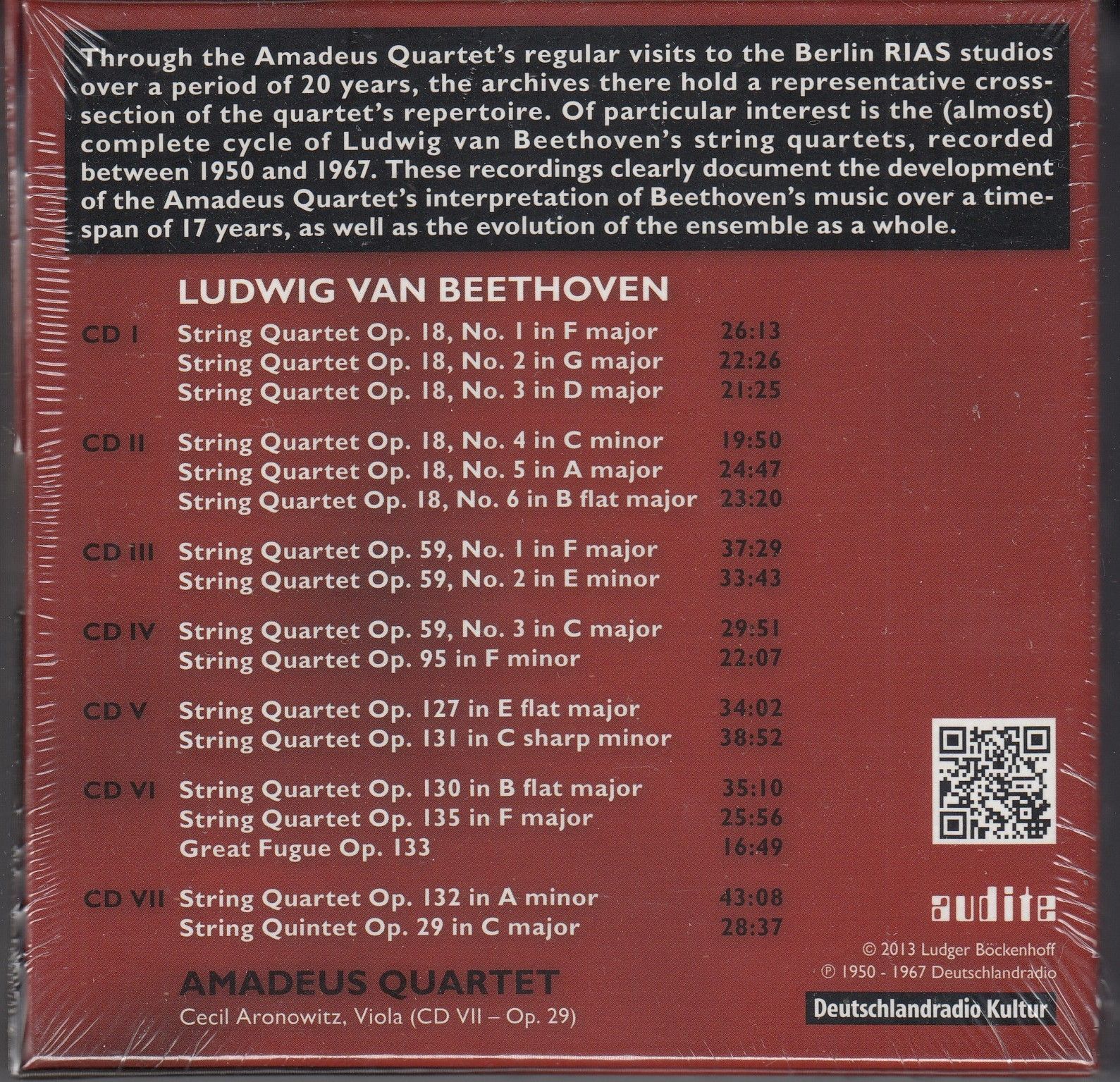 7 CD Audite ベートーヴェン 弦楽四重奏曲選集 第1 9 11 16番 弦楽五重奏曲ハ長調Op 29 セシル アロノウィツ va アマデウス四重奏団 1950 1967