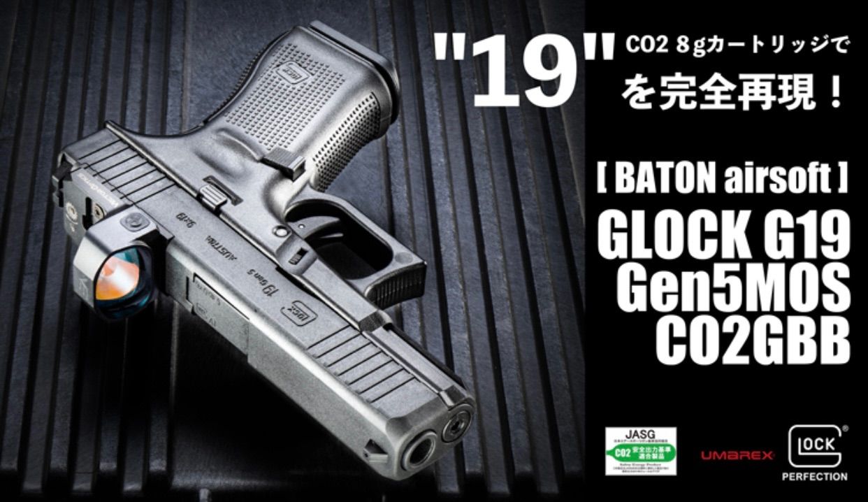 もっとも有名なポリマーフレームオート GLOCK G17 のコンパクトモデルG19をモデルアップしたCO2ガスガン GLOCK G19 Gen5 MOS CO2GBB 。CO2 8gマガジンを新設計し、G19のスタイルをCO2ガスガンで完全再現。BATON airsoft は GLOCKトイガンの日本正規ライセンスを取得し、GLOCK監修によりリアルな外観とリアル刻印を再現。特徴的なスライドカットやグリップパターン等の外見のリアルさだけでなく、独自の内部構造とすることで、樹脂スライドながら MOS(モジュラー・オプティック・システム)までも実装している。4種類のMOSプレートが付属し各社ダットサイトに対応。