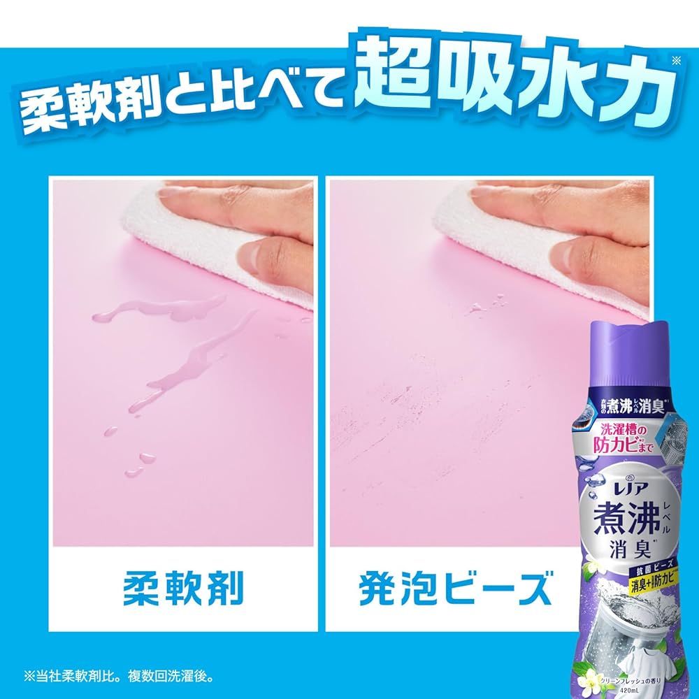 衣類の煮沸レベル消臭*1 洗濯槽の防カビ*2 まで! レノア 超消臭 煮沸レベル消臭 抗菌ビーズ 消臭+防カビ クリーンフレッシュ