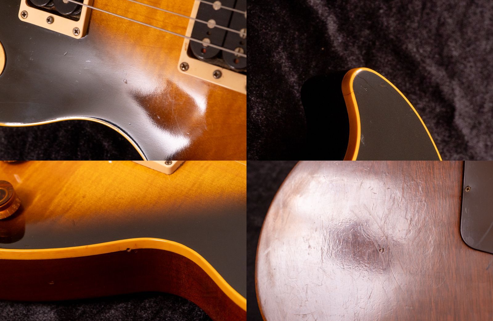 ボディや塗装面には経年使用によるダメージが見られます。PUカバーに傷があり、全体的に日焼けが進行しています。ボディトップ1弦側には塗装剥げと水玉状の跡があり、セレクターノブにも傷、コントロールノブには艶消えが見られます。セレクター付近・ブリッジ付近・1弦側カッタウェイ付近には複数の打痕があり、その他にも細かな擦り傷や打痕が点在しています。