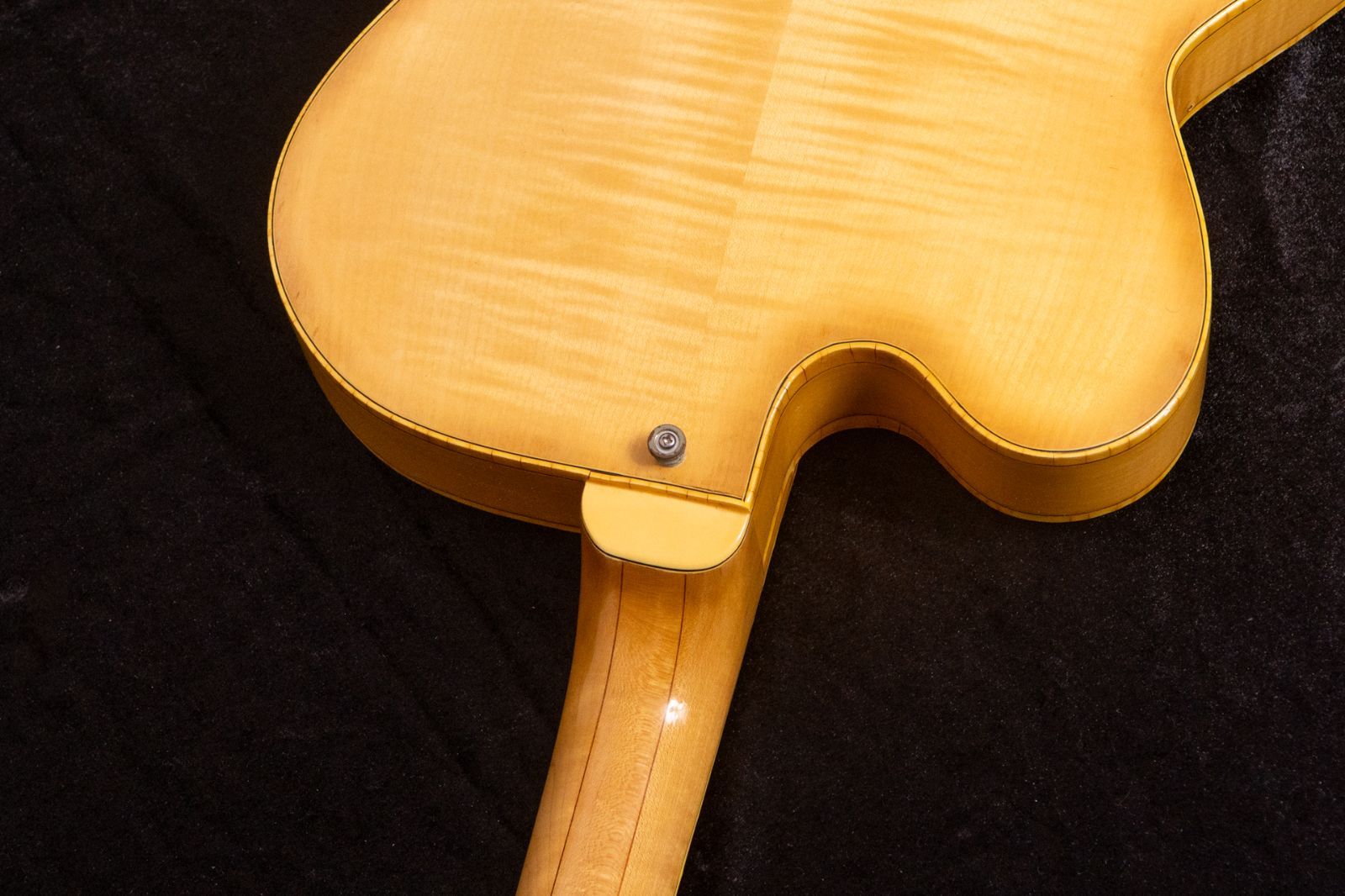 ボディサイド全体には細かい打痕や擦り傷が点在し、ボディバックのバインディング沿いにも打痕、中央部にも複数の打痕や線状の傷があります。また、ボディトップのネックジョイント部では接着材が見えてしまっています。