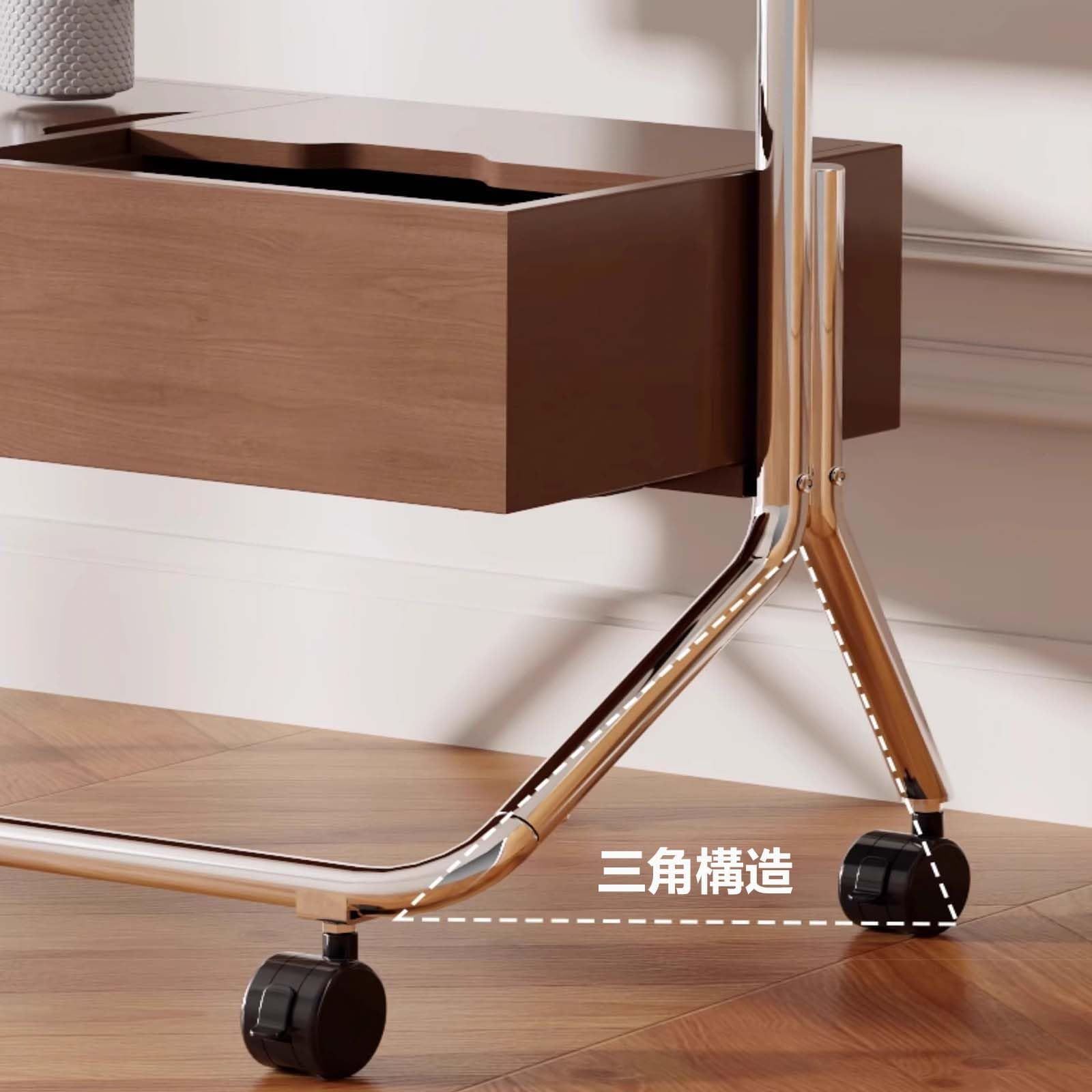 安定したデザイン&移動に便利:このテレビスタンド全体のフレームはステンレス制で、支柱を支える鋼管は28mmです。底部は三角構造を採用し美観を実現するとともに耐荷重も高めました。また、下部にはブレーキ付きのキャスターが付いており、使用に応じてテレビの位置やシーンを変えることができます。