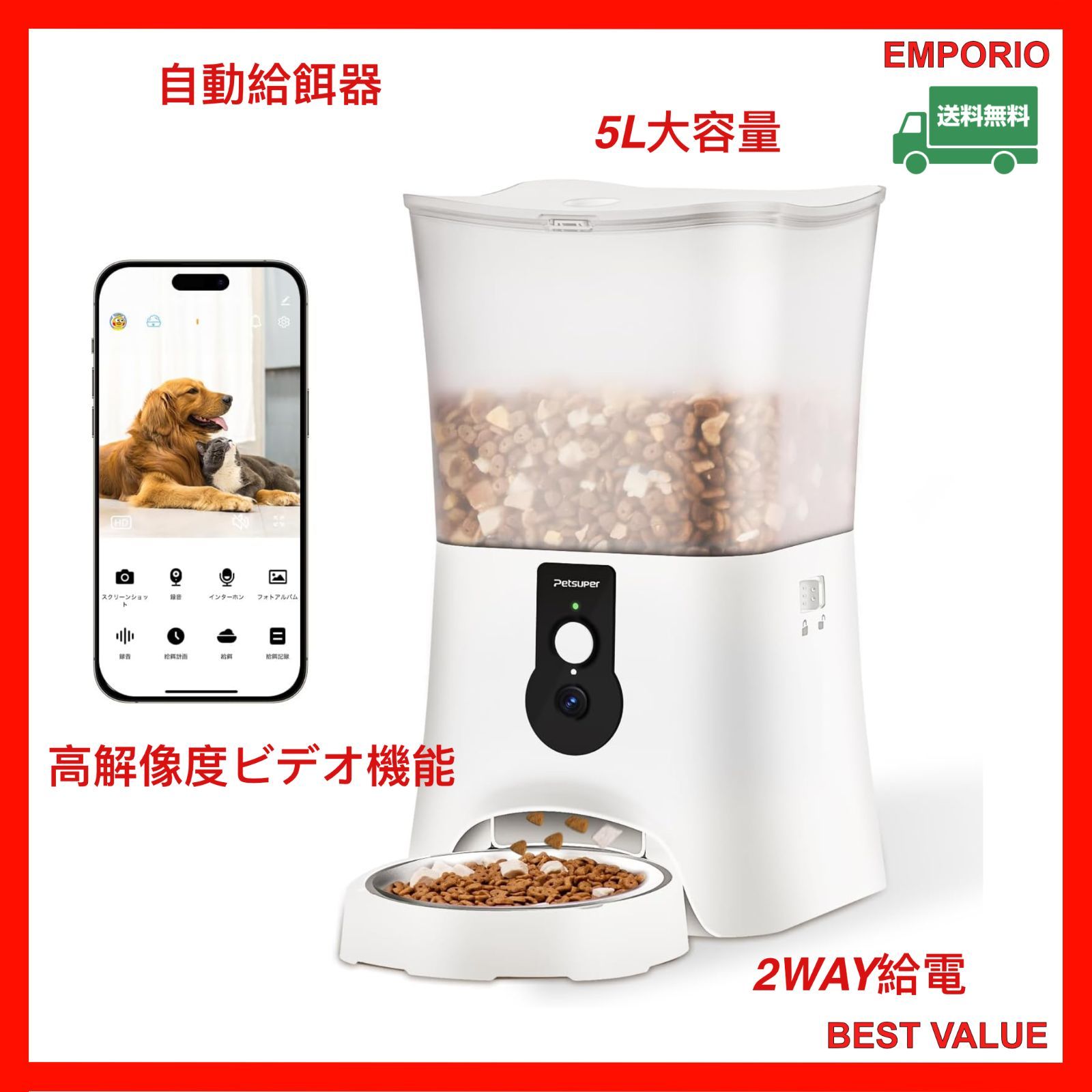 PETSUPER 自動給餌器 猫 給餌器 中小型犬ペット用 自動餌やり器 5L大容量 wifi接続 早食い防止 定時定量 1日6食 1食0-20分量設定可 手動給餌可 3重鮮度保持 2WAY給電 録音呼びかけ機能 双方向会話 留守も安心 日本語対応説明書付き Android/IOS対応 半透明タンク ホワイト