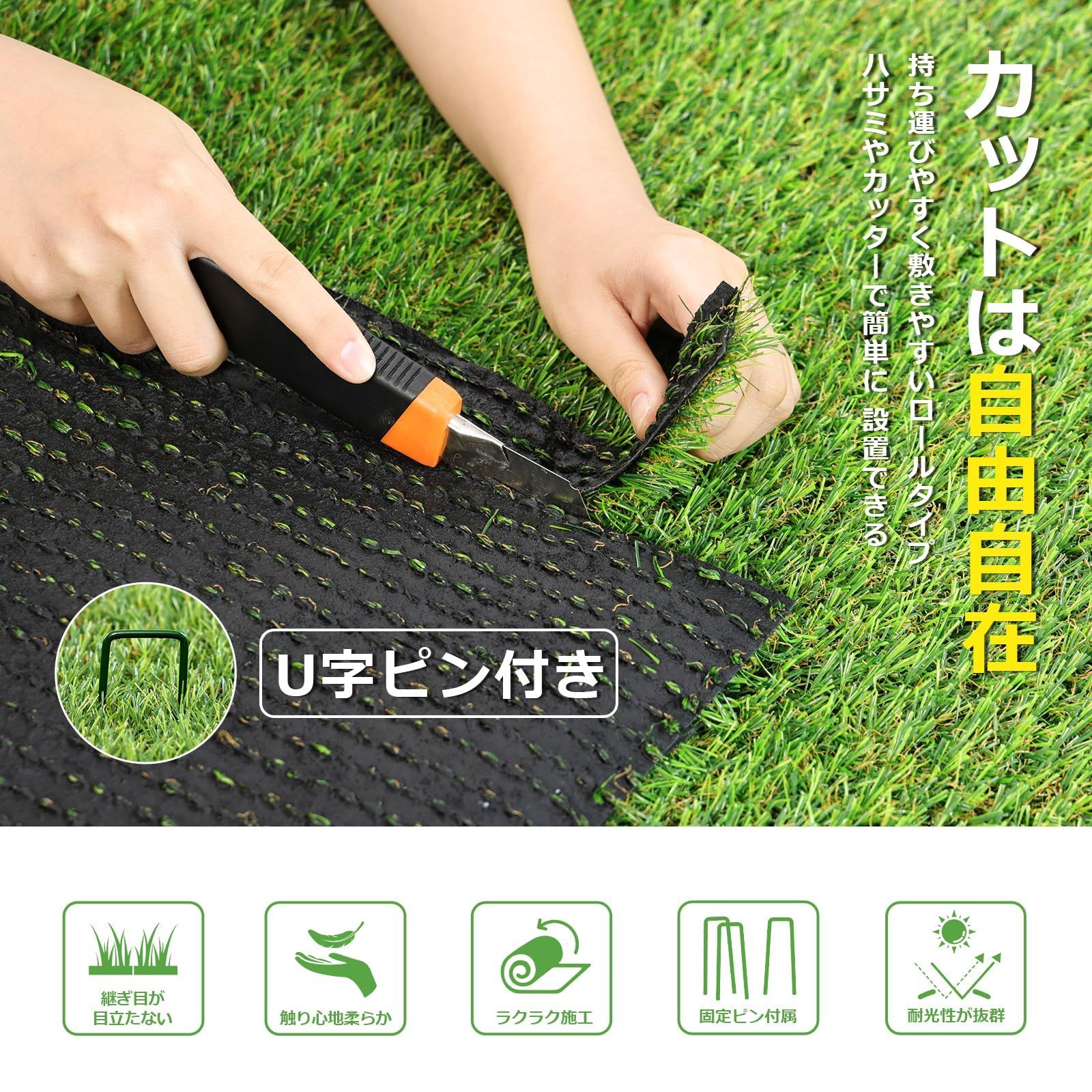 【材質とサイズ】サイズ:幅1m×長さ10m×芝丈20mm/重量:約15kg(緑色塗装のU字ピン×24本)