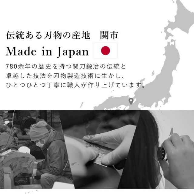 更に刃先には関の伝統技術である刃付けを熟練職人により、一丁づつ丁寧に仕上げて抜群の切れ味と機能性を実現しています。