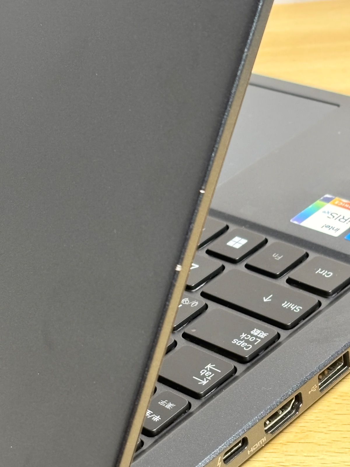 ・最後の2枚の写真ですが、ちょっと小さいので見にくいですが、パソコンの液晶脇のところに2つ光っている部分が見えます。どこかにぶつけた様で、傷となり、地の合金が光っています。