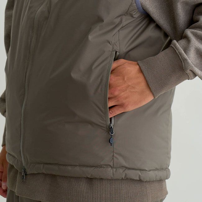 襟はネックを高めにし、首元の保温性も確保しつつ、腕の可動域を広げるベストタイプはカットソーからシャツ、パーカーまで幅広く着回すことができ、秋から春まで幅広いシーズンの着回しに対応。