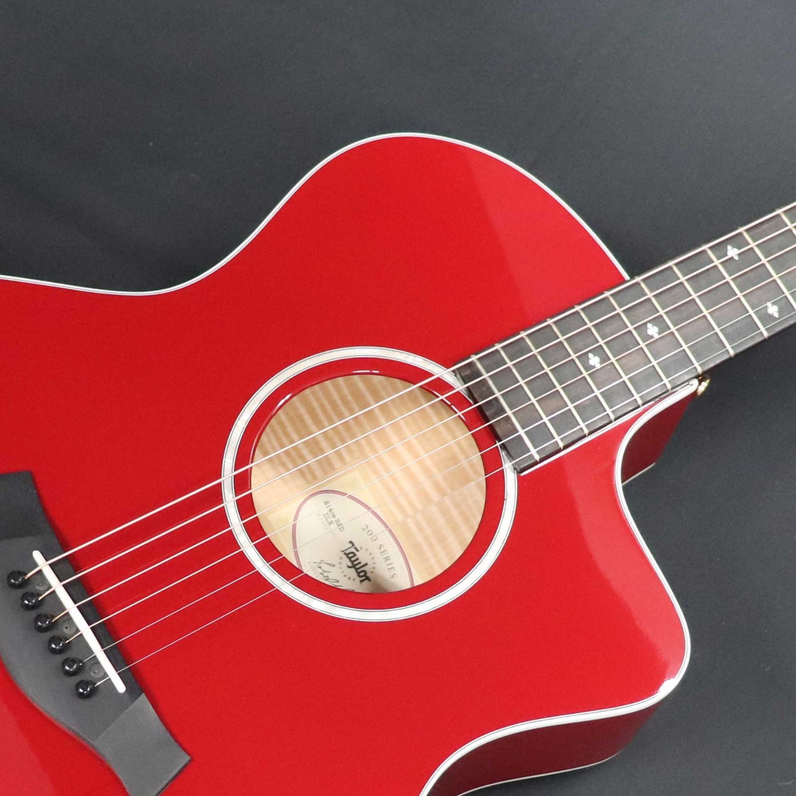 214ce DLX RED はレッドカラーオールグロスフィニッシュにホワイトバインディングが目を引くニューカラーモデル。シトカ・スプルース単板のトップにレイヤードのメイプルをサイドとバックに使用、ナット幅は1-11/16インチのナローネック仕様でプレイアビリティの良さとバランスのとれたサウンドが特徴です。ケースはハード・シェルケースが付属します。