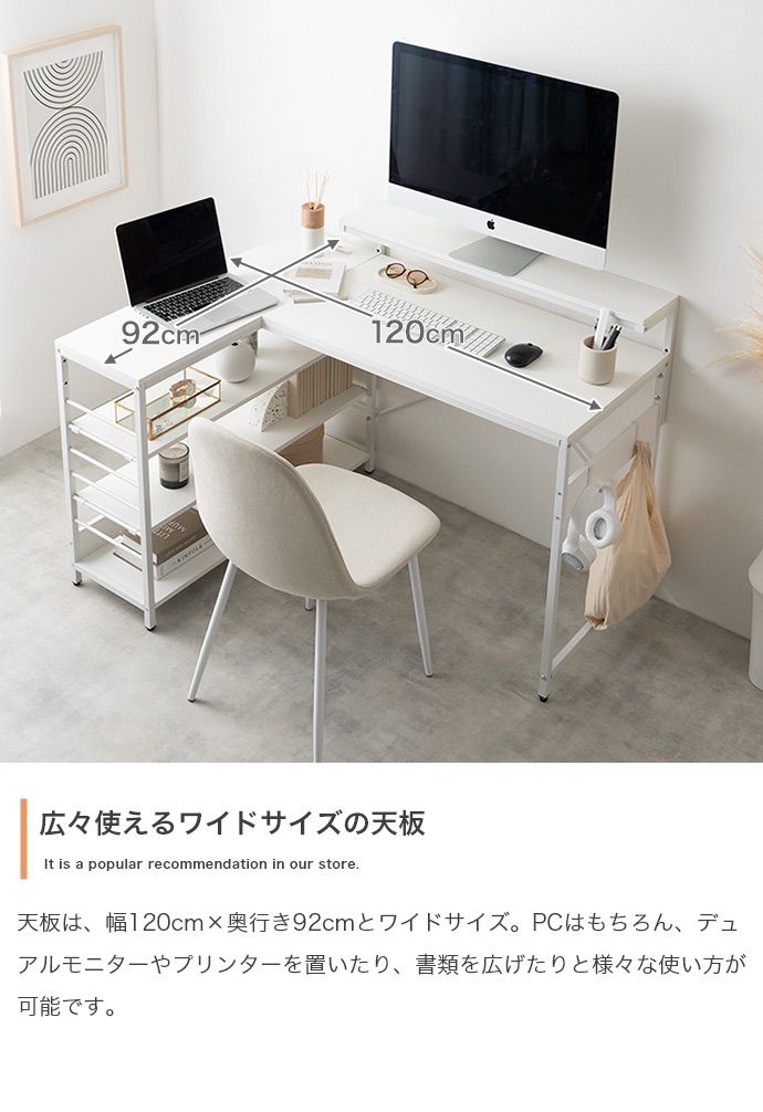 デスク、モニター台、ラックが一体となった『Lauren(ローレン)』L字型デスク。広々とした天板は、パソコン作業しながら書類やノートを広げることが可能。モニター代、ラックは左右組み換えでき、好みの向きに合わせてご使用いただけます。また、嬉しいUSB・コンセント付き。その場にいながら充電や給電をしていただけます。効率的に作業を進められる「使い勝手」にこだわった設計です。