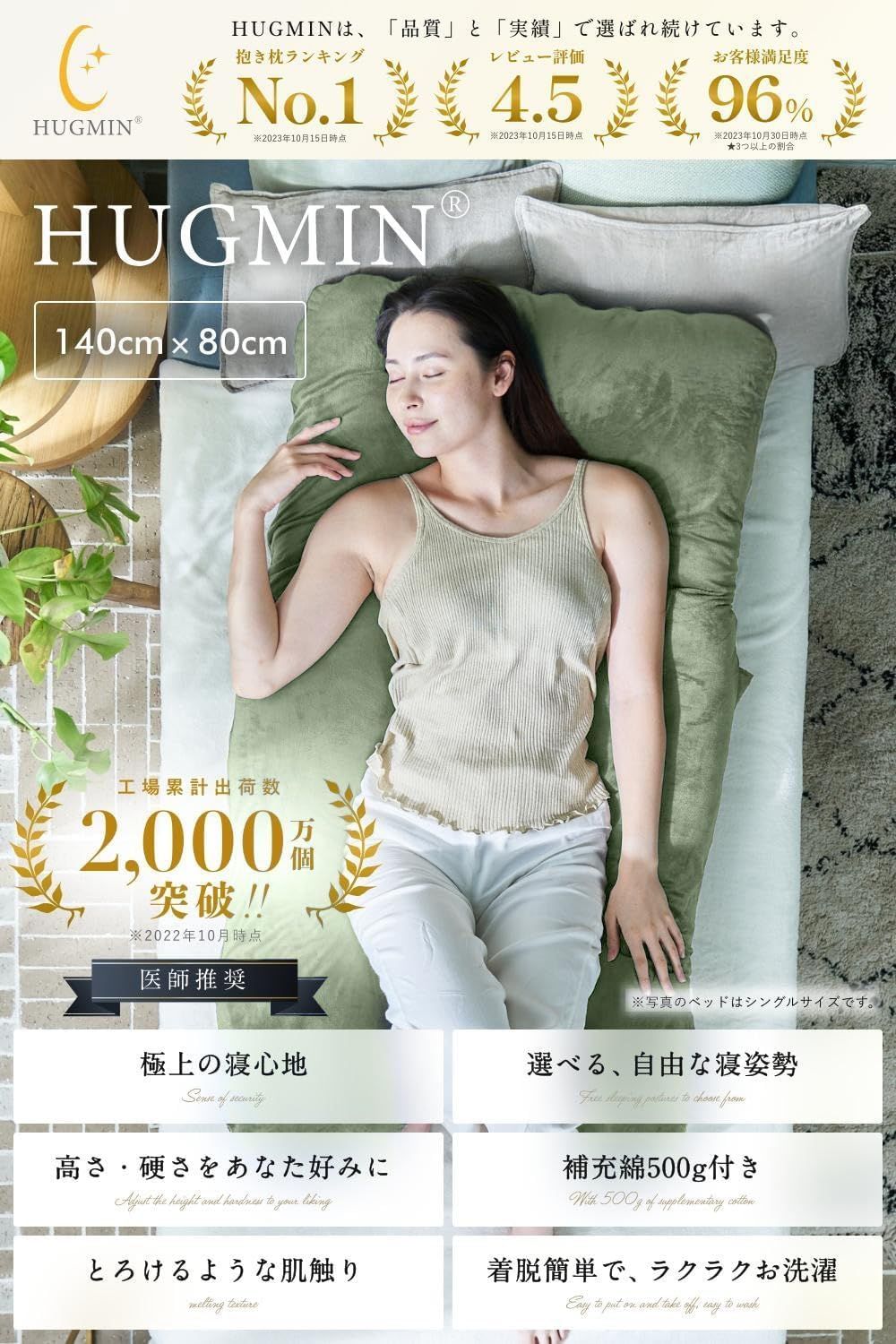 ?【いびきの軽減】抱き枕はいびき軽減に効果的ですが、HUGMINは包まれる形なので睡眠中に寝相で枕を突き飛ばすことがありません。朝までずっと静かに眠れる。