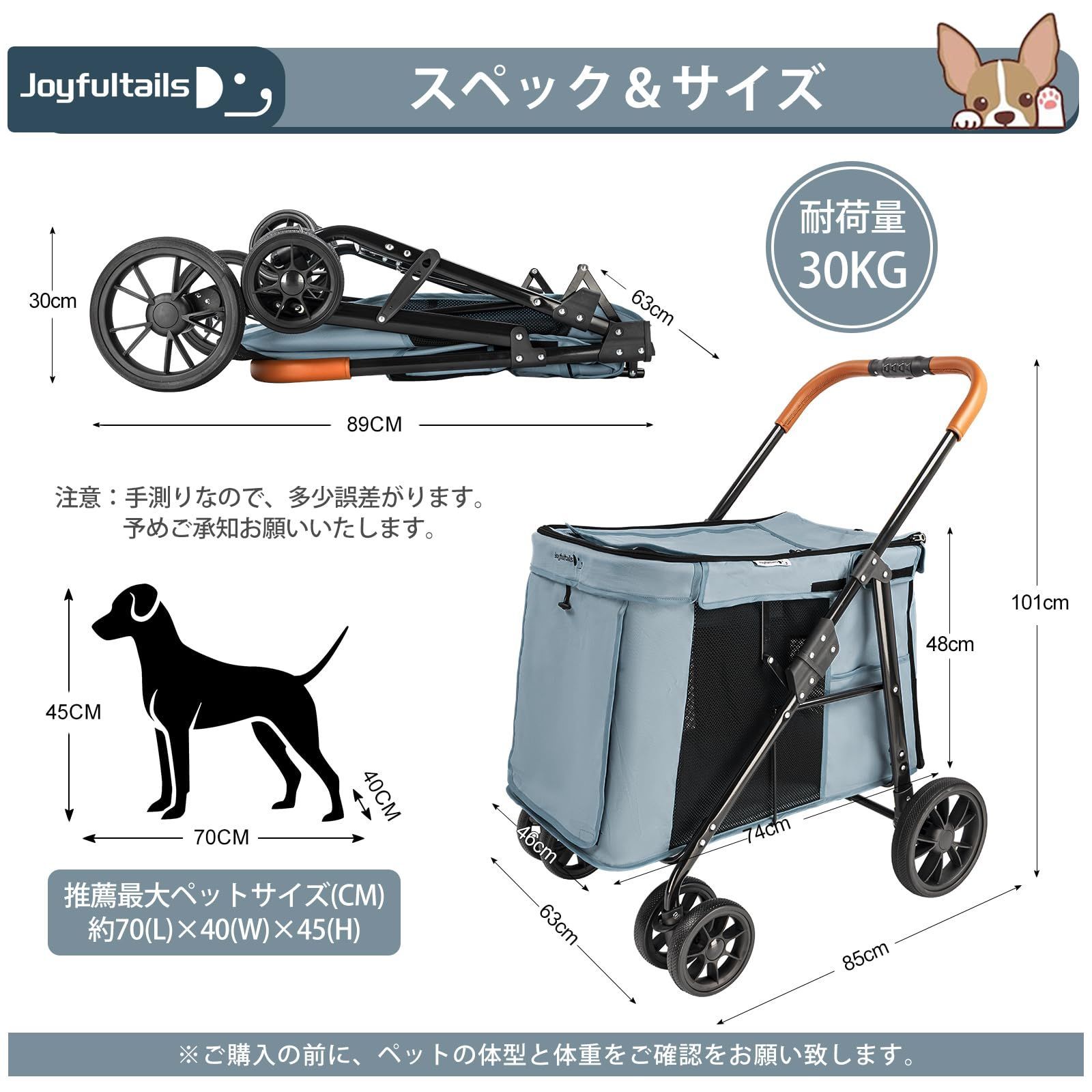 【大きいスペース&安心の30KG耐荷重】ペットバギー内のスペースは約70×40×45cmで、十分なスペースがあるので、ペットはその中に横たわっても退屈に感じません。耐荷重は約30KG、大型犬・中型犬・多頭用にも大活躍です。♪