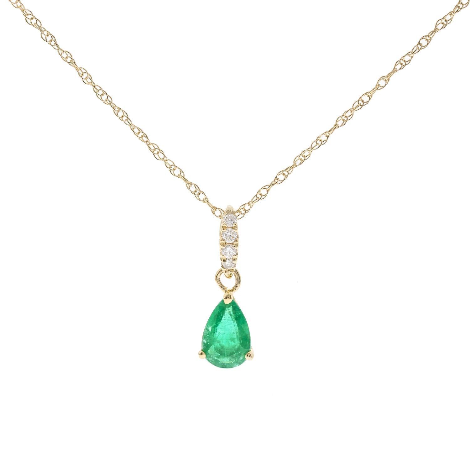 価値:歴史を通して、エメラルドストーンは真の愛と豊かな富を象徴しています。エメラルドを自然、希望、更新、成長の美しさに関連付ける印象的な緑色の色を持っています。耐久性のある低アレルギー摩耗のために、プレミアム10kyゴールドで作られた女性のためのこの美しい天然エメラルドペンダントにふける。ナチュラルダイヤモンド、0.03カラット、H-Iカラー、I1の透明度でアクセント。 10Kゴールドチェーンで着用する準備ができています。ペンダントには、1.0 GMゴールドと0.33カラットピアカットナチュラルザンビアエメラルドがあります。