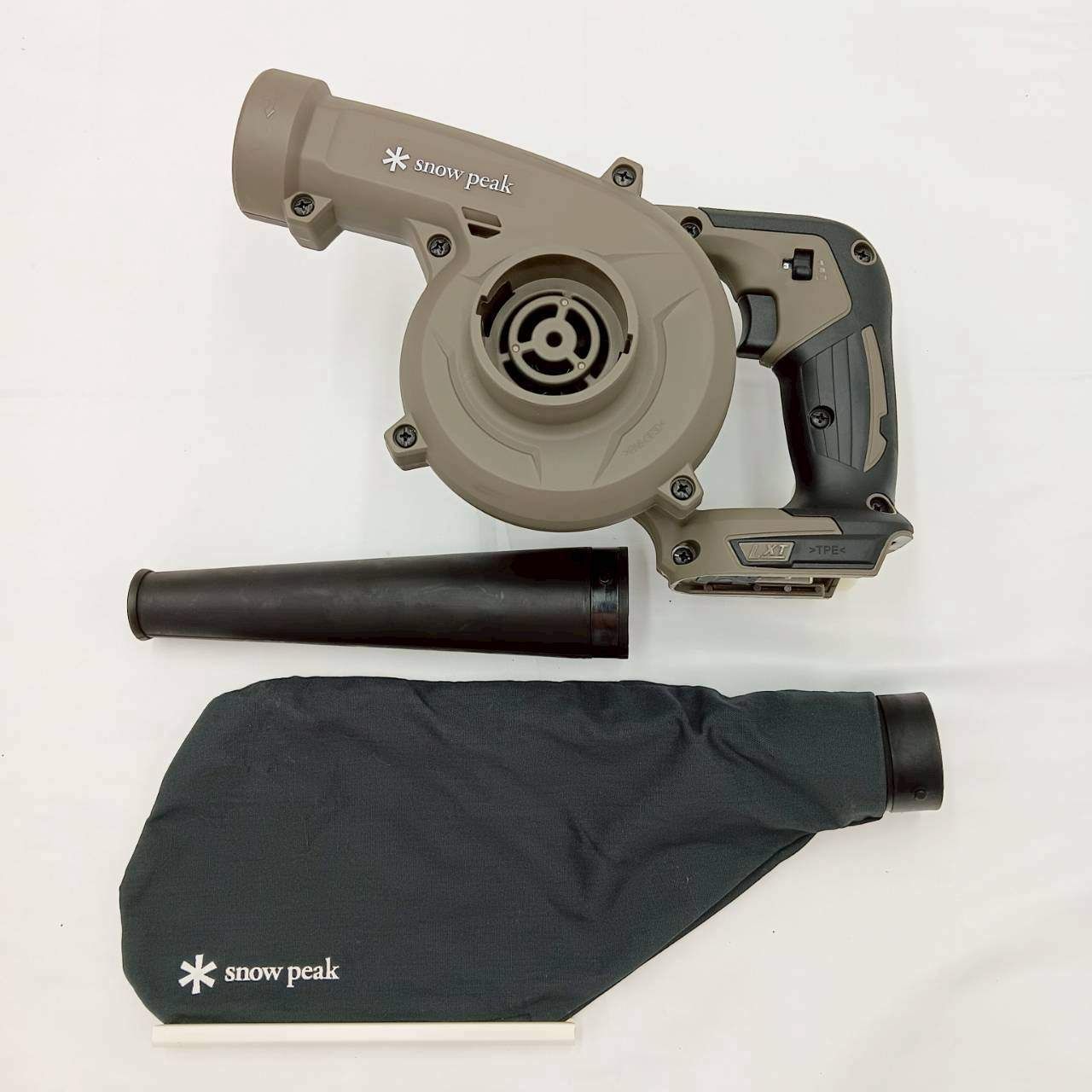 〇備考:リチウムイオンバッテリー(別売り)対応のブロワ。火おこしやテントの水滴飛ばしだけでなく、先端を吸気口に付け替えれば、簡易掃除機としてインナーテント内のゴミを吸うことができます。色はテント内にあっても違和感のない落ち着いた配色となっています。小さいながらも風量があるブロワです。