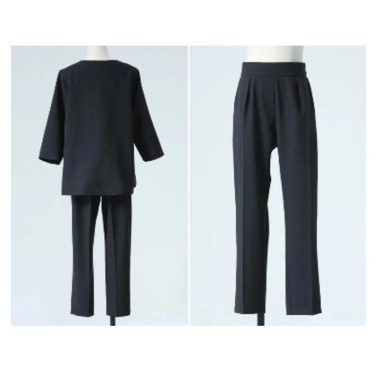 L 前/後着丈66/67cm 肩幅42cm 袖丈44cm バスト117cm ウエスト(ストレッチ)70-90cm ヒップ108cm 裾幅18.0cm パンツ総丈90cm