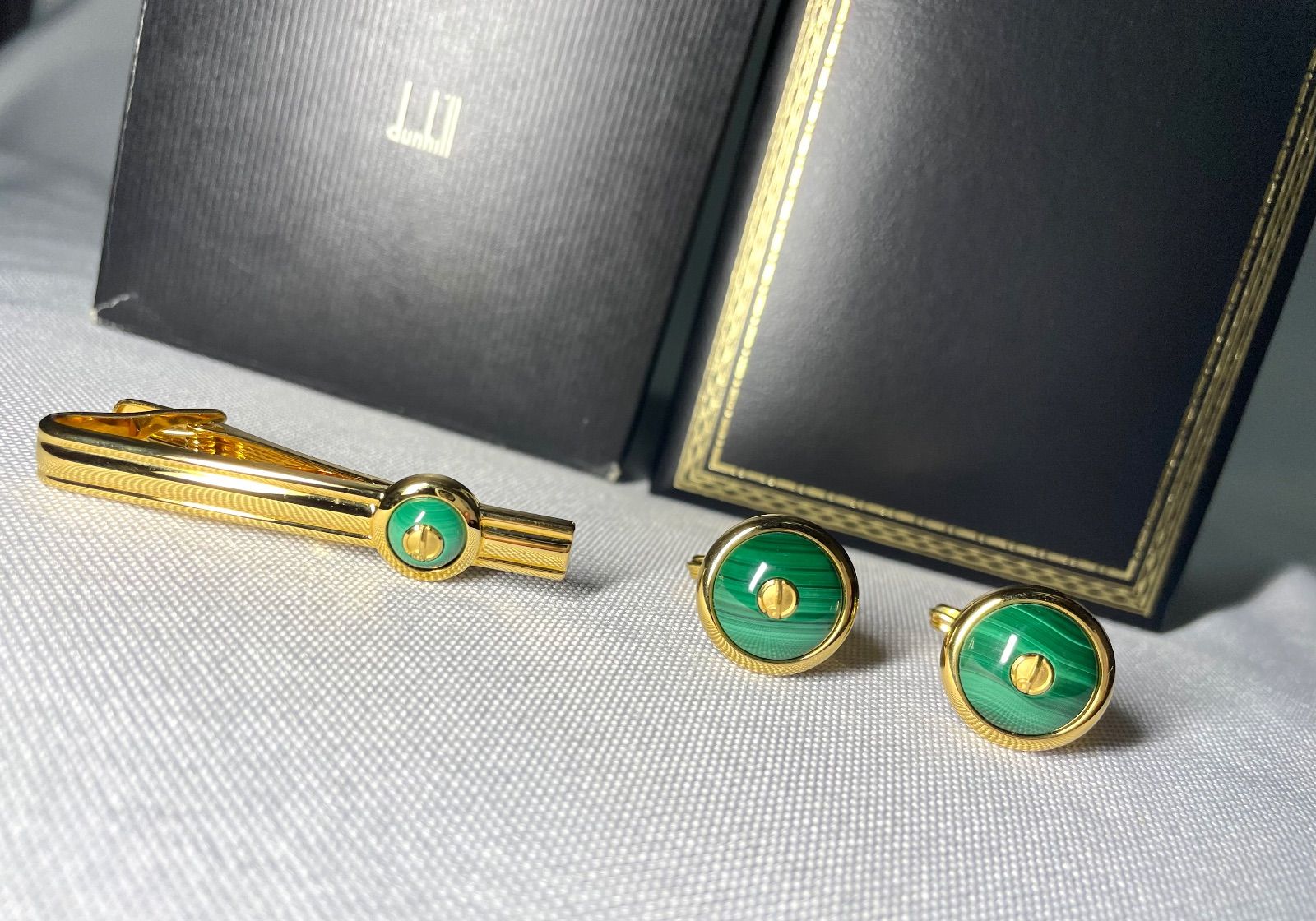 Dunhill ダンヒル グリーンマラカイト装飾 dロゴ オーバルカフス ネクタイピン セット カフリンクス タイピン ボタン 付属あり