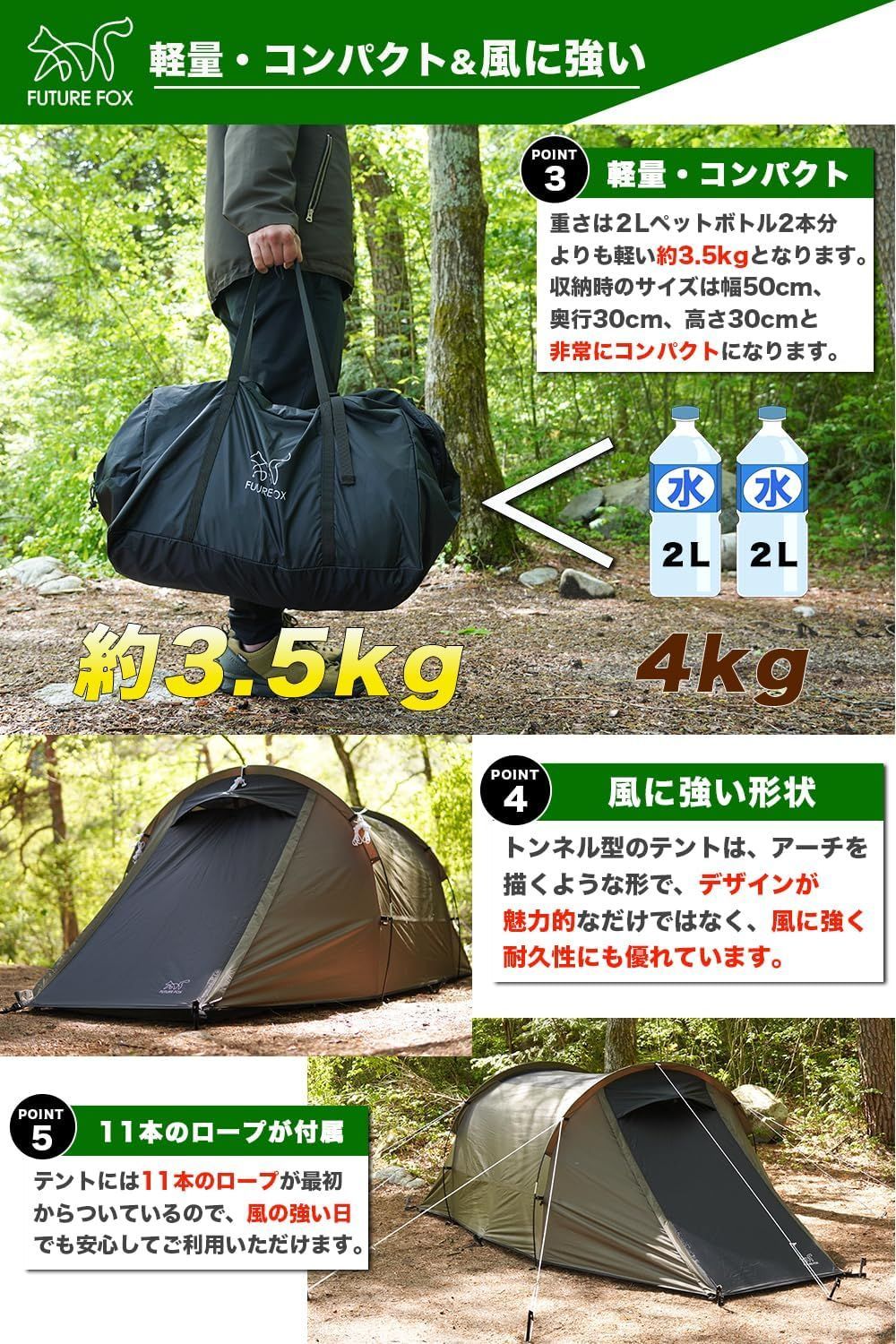 FOX-BUCHE フォックスブッシュ トンネルテント カマボコテント 軽量 コンパクト 1-2人用 ツーリングテント インナーテント付き