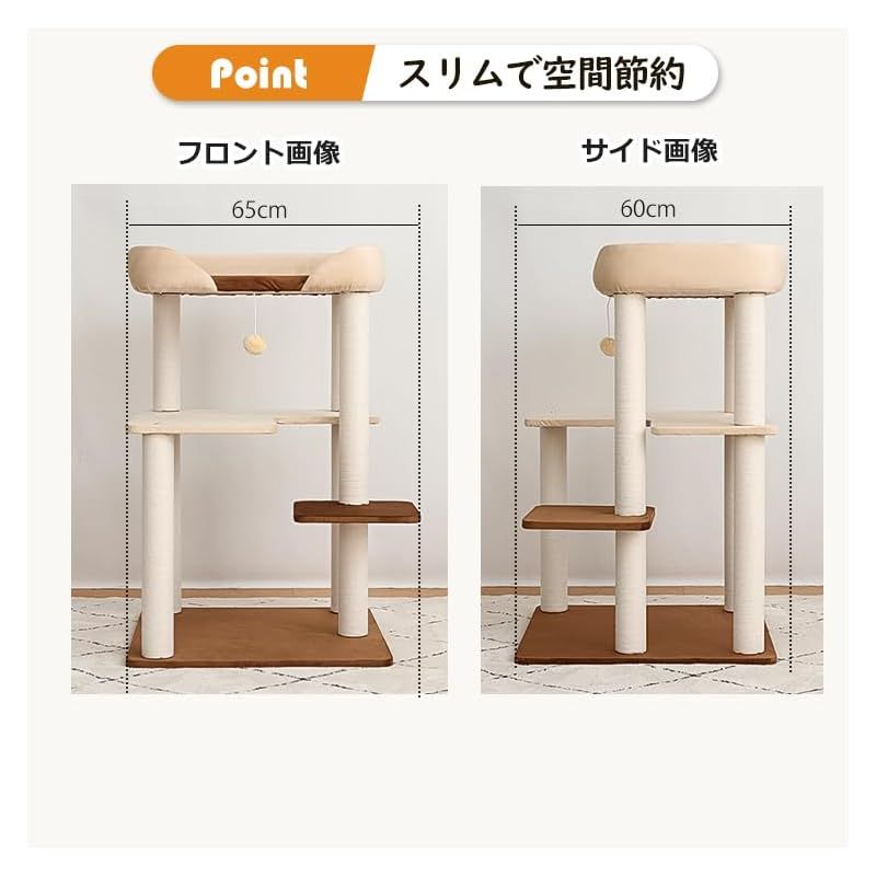 キャットタワー 据え置き おしゃれ クッション入りベッド 巨大土台 多頭飼い コンパクト ワイドベース60*60cm 木製ボードにベルベット張り 広々 シニア猫 成猫 シニア猫 冬夏兼用 涼しいござ付き 大型猫 安定感 低め 転倒防止デザイン お掃除楽々 ワイドベース 展望台 猫ベッド 運動不足解消 ストレス発散 省スペース スリム 爪とぎポール コットン紐 高さ95cm 遊び場