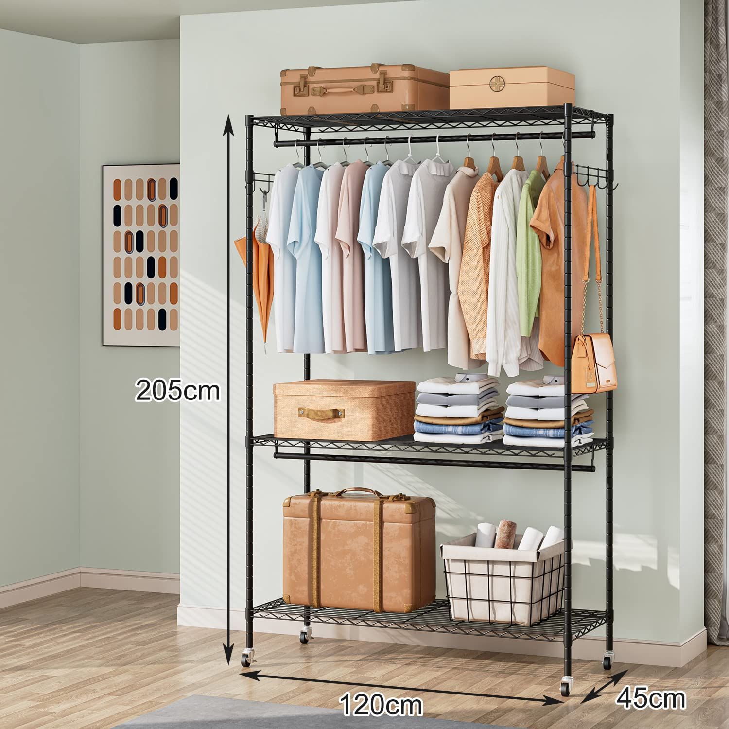 ワードローブ 大容量 キャスター付き 頑丈 洋服ラック 棚付き ハンガーラック 洋服掛け スチールラック Huaniun 幅120×奥45×高さ205 cm