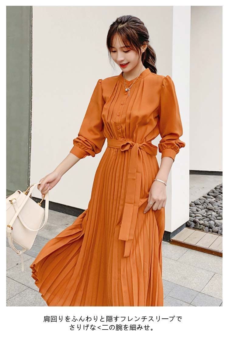 長袖 ワンピース プリーツ プリーツワンピース レディース 春 夏 秋 冬 ロング マキシ ロングワンピース マキシワンピース シャーリング 裏地付き きれいめ ウエストリボン付き jzxd 1302