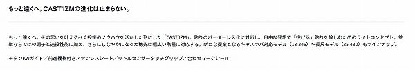 もっと遠くへ。その思いを叶えるべく投竿のノウハウを活かした形にした「CAST’IZM」。釣りのボーダーレス化に対応し、自由な発想で「投げる」釣りを愉しむためのライトコンセプト。並継ならではの調子と遠投性能に加え、さらにしなやかになった穂先は幅広い魚種に対応する。新たな提案となるキャスラバ対応モデル(18-345)や長尺モデル(25-430)もラインナップ。