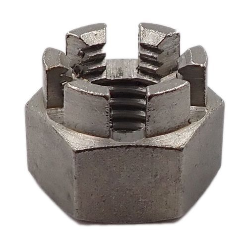 通常の六角ナットにみぞが付いた形状で、ねじのゆるみ止め機能があります。締結、固定に使用し、相手のボルトに開けた貫通穴とナットのみぞを通して割りピンを差し込むナット脱落防止用ナットです。