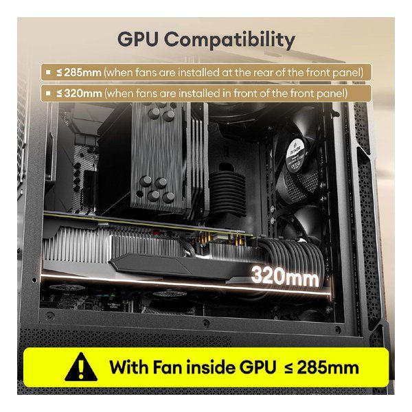 ※フロントファンを初期搭載位置のままケース内側に設置した場合、最大285 mmまでのカードに対応します
