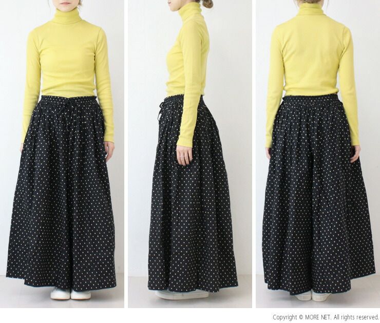 ・ワイドな筒幅と軽い生地感でパンツなのにスカート見えするシルエットがポイントです。