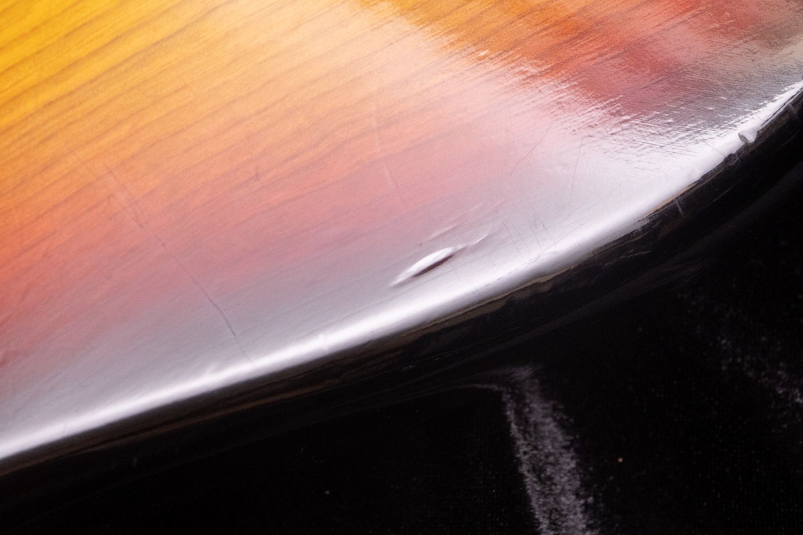 ボディや塗装面には、ボディトップの6弦側カッタウェイ部、セレクター付近、ブリッジ付近、エルボーカット付近に打痕が見られます。ボディサイド全体にも打痕があり、ボディバックのスプリング付近やネックプレート付近にも打痕があります。また、ボディバック両カッタウェイ部には擦り傷が確認できます。