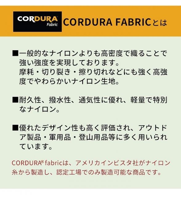 軽量で耐久性の高いコーデュラ素材を使用。