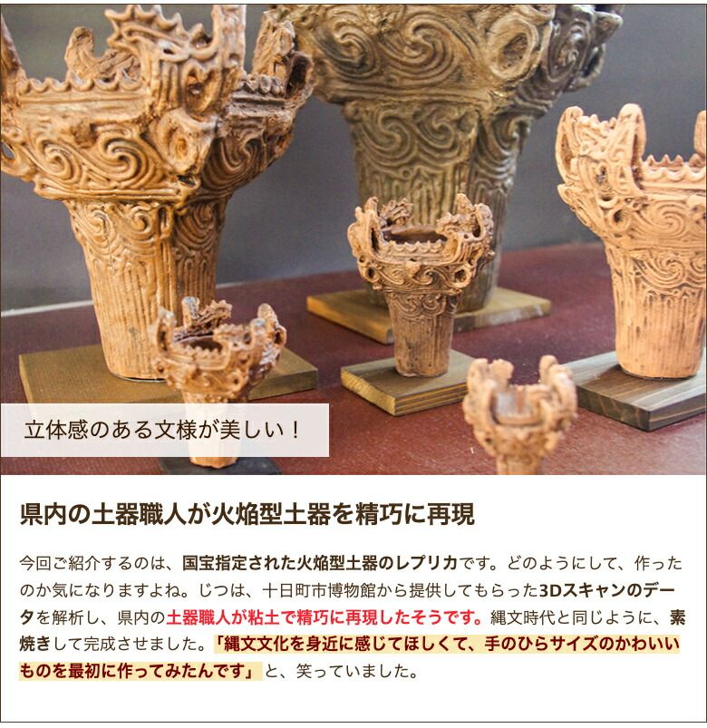 十日町市で出土した火焔型土器は、国宝に指定されています。燃え盛る炎のようなフォルムがエネルギッシュ!そんな火焔型土器がレプリカで蘇りました。お部屋に飾って、縄文時代に思いを馳せてください!