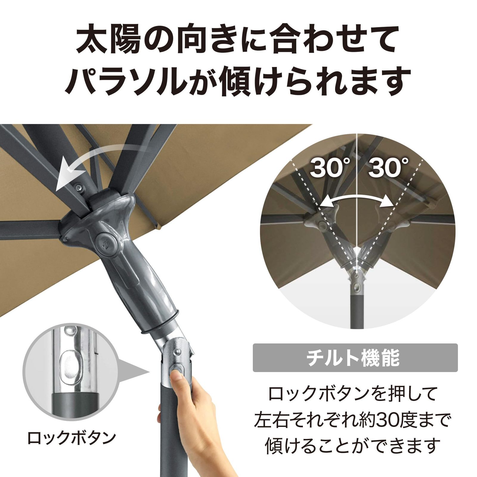 チルト機能付きで、ロックボタンを押して左右それぞれ30度まで傾けることができます。日差しの向きに合わせて、パラソルの向きを調節可能。