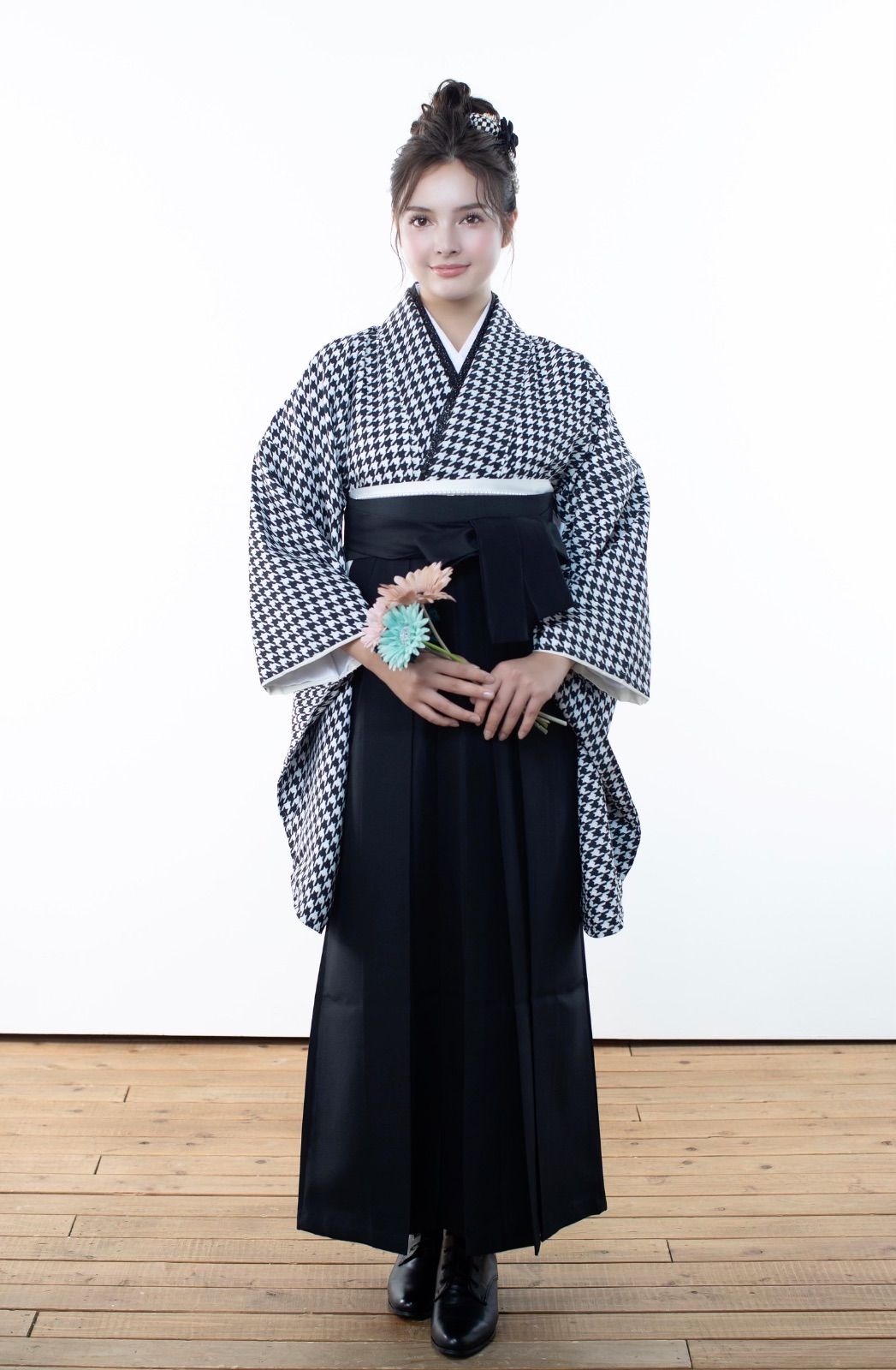 着物ジェンヌ 卒業式袴3点セット 千鳥格子 黒 白 モノトーンコーデ 袴 卒業式 二尺袖着物 大学生 小学生 レディース着物 袴セット