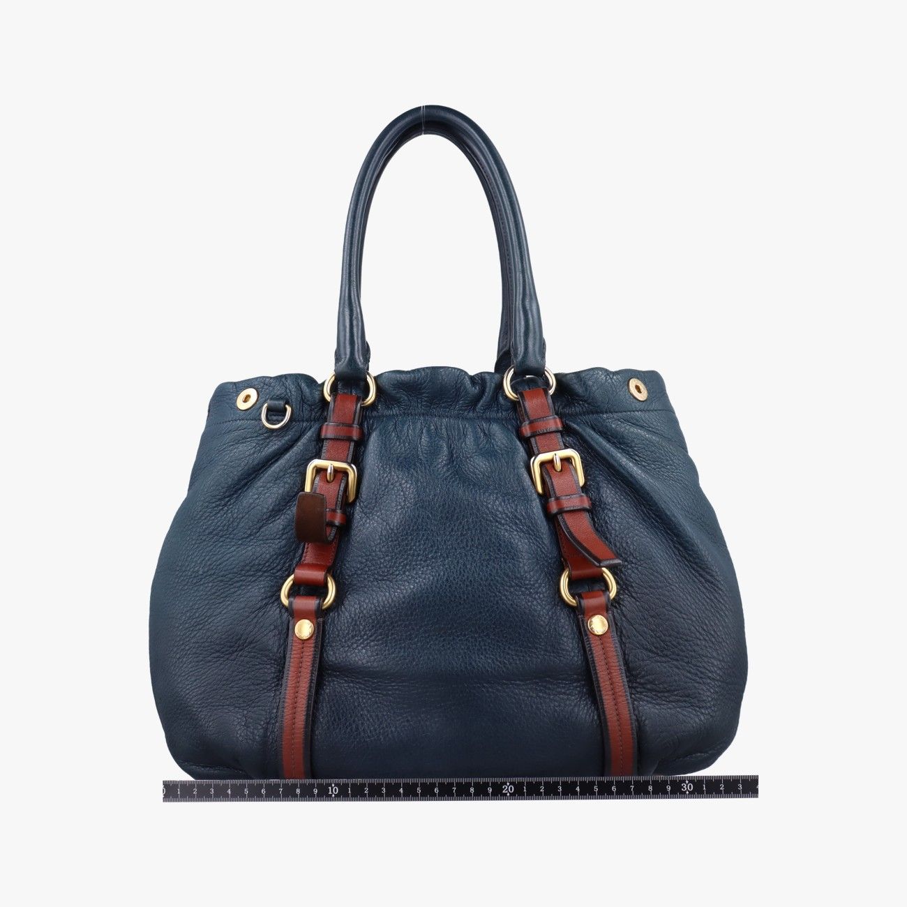 プラダPradaスクエアバックルネイビー×ブラウンレザー
