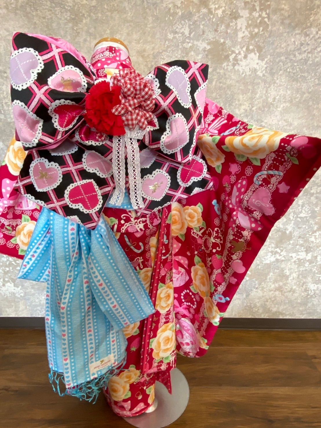 ・帯の飾り、髪飾りの花が少し潰れています。