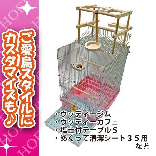 付属品:35エサイレ2ヶ、35エサカバー2ヶ、15φ止り木355mm2本、T字止り木(小)1ヶ、フンきり(足付)1枚、引き出し1枚、シャッター1枚