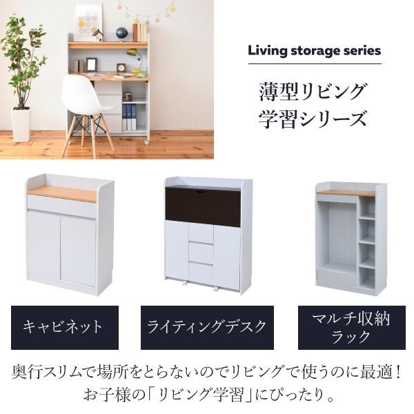 折り畳み式天板は使いたいときだけ広げて使わない時は畳んですっきり、ライティングデスク。薄型で省スペースなのでリビングに最適。お子様の「リビング学習」から、ママやパパのパソコンデスクとしても。上部にはランドセルなどを置けるオープン収納部、下部には扉収納部と3段の引出しで、収納力にも自信あり。コンセント、配線コード穴もあるので、PC、周辺機器の設置もOKです。