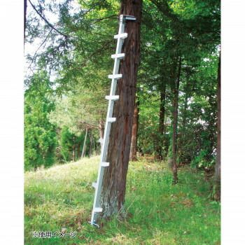 樹木にフィットするU型の上端金具は滑り止めのついたアルミ鋳物製。木に巻付けるチェーン付。踏ざんは幅広仕様。下段は昇降用の左右交互型、上段は両側水平踏ざんです。