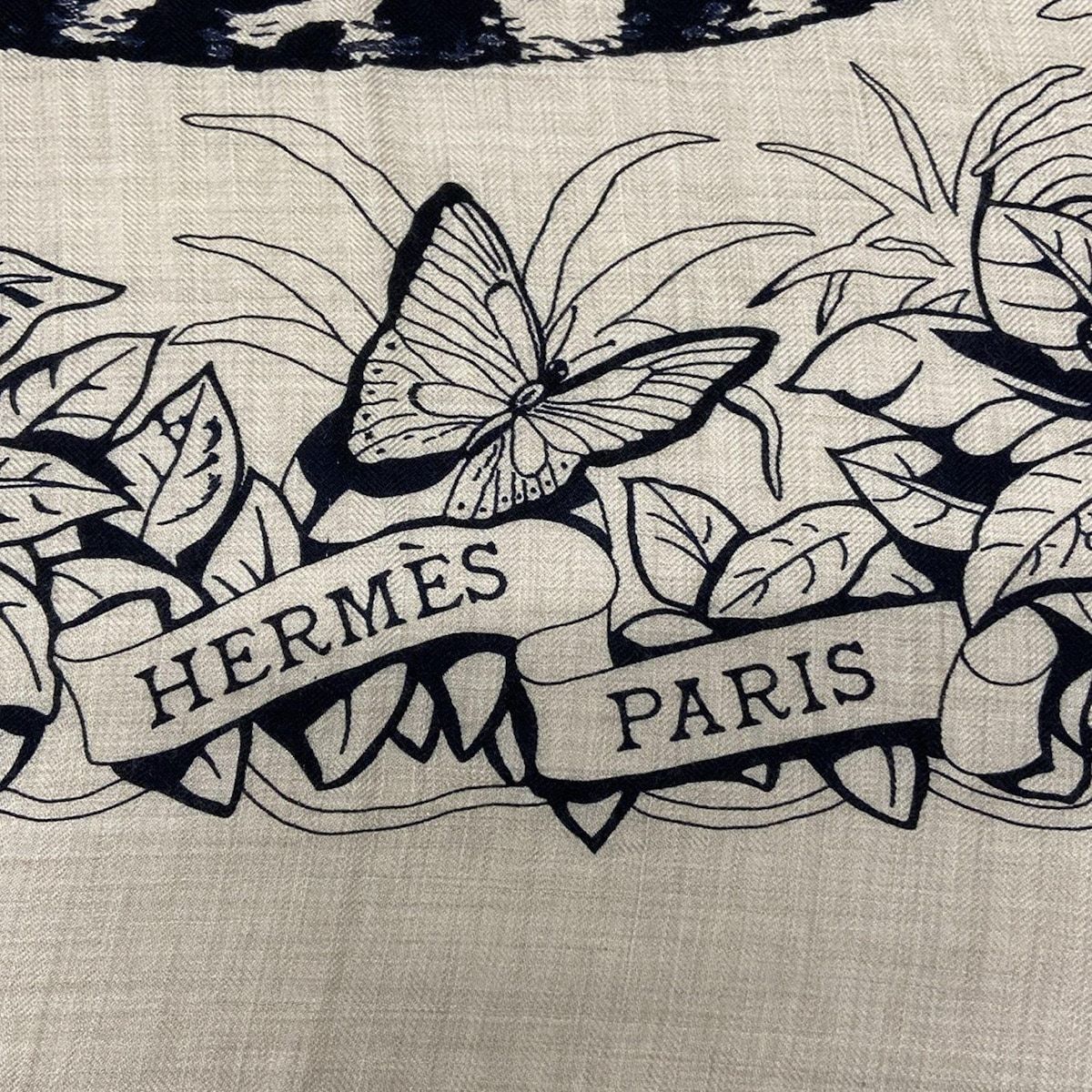 HERMES エルメス ストール ショール カレ140 ベージュ×ネイビー×黒 JUNGLE LOVE カシミヤ シルク