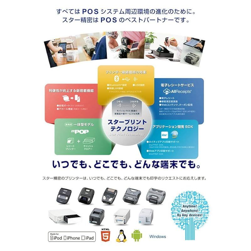 Bluethooth/USB/LANの接続に加え、ライトニングケーブルによるiOS機器との有線接続も可能。1Dバーコードリーダーやカスタマーディスプレイ充実したオプションの周辺機器が使えます。mC-Printを介した一元的制御が可能です。