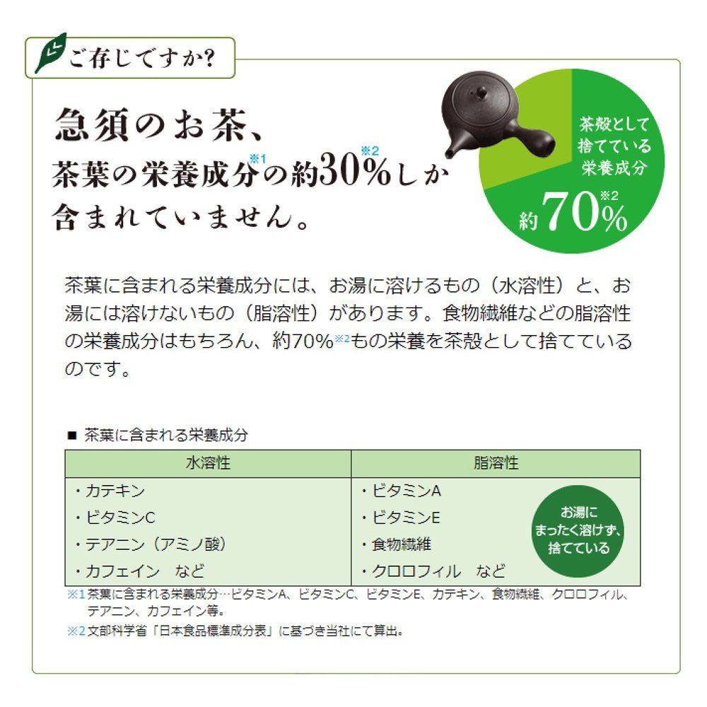 50Hz-60Hz共用定格消費電力:930W付属品:お茶うす専用清掃用ブラシ、お茶スプーン(大:茶葉用(約2g)、小:粉末用(約0.6g))、メニュー集、取扱説明書、ご使用ガイドお茶うす:消費電力:30W、粉末生成量:4.0g/15分(細)(※茶葉の種類や葉の長さ、太さなどによって増減します。)、定格時間:15分お茶メーカー:消費電力:900W、最大使用水量:420mL、温度ヒューズ:216℃電源コードの長さ:約1.2m