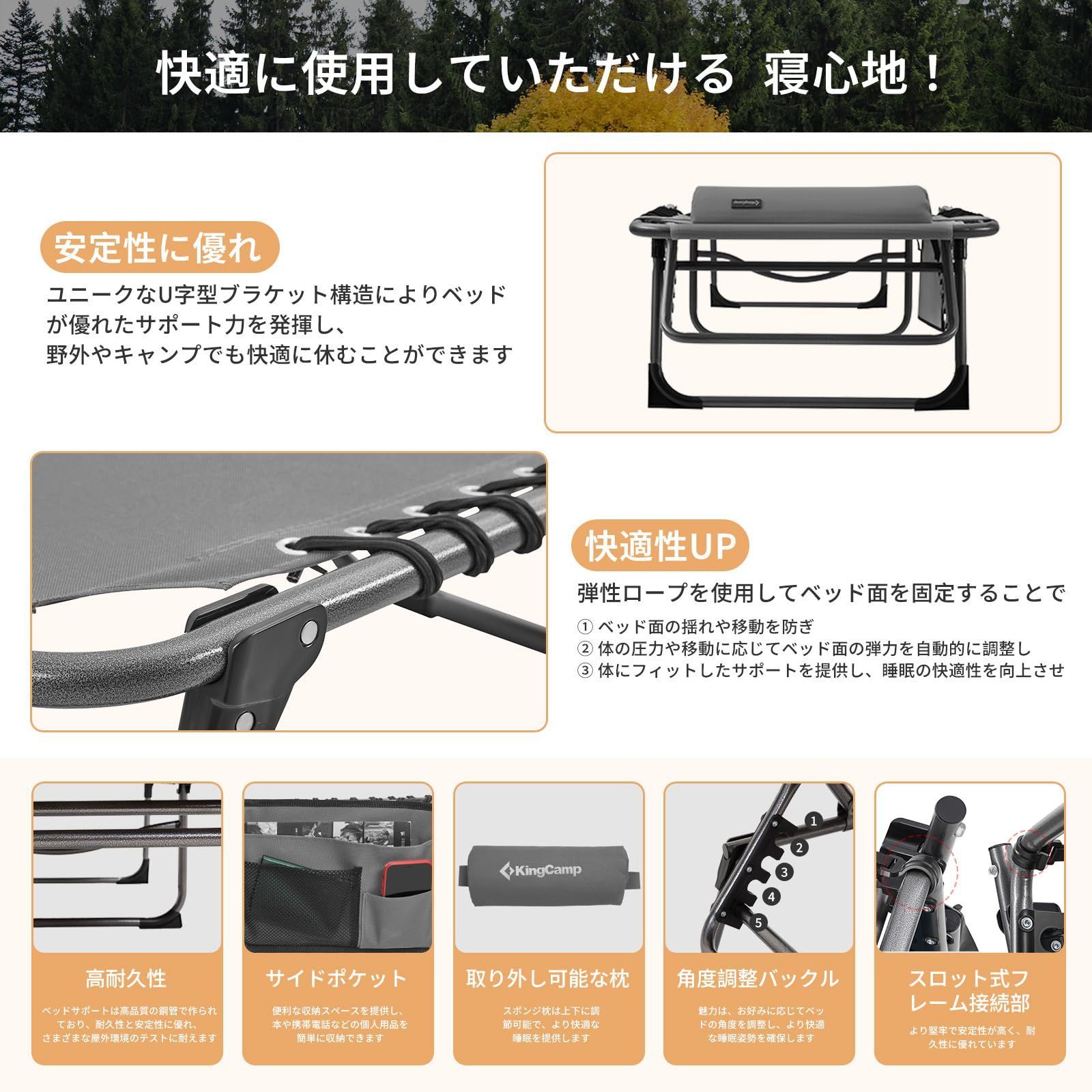 商品 耐荷重120 kg 600 Dオックスフォード 小物収納 ビーチチェア 寝心地良い 昼寝 5段階調節 室内外兼用 アウトドア 190 簡易 x 3 way コット 59 折りたたみベッド サマーベッド 37 cm KingCamp