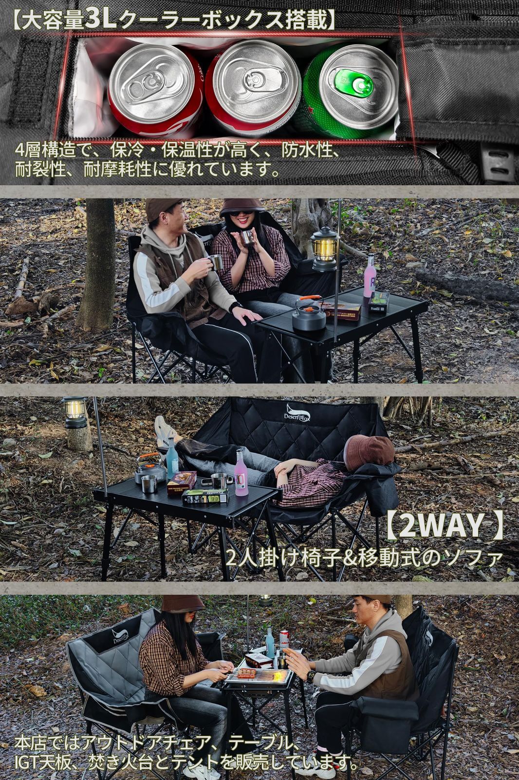 在庫 DesertFox キャンプ 椅子 2人掛け アウトドアチェア 二人用 折りたたみ コンパクト ソファチェア カップルチェア 独自開発のカップホルダー クーラーボックス 耐荷重300 kg 枕付き 軽量 イス 収納袋付き お釣り 登山