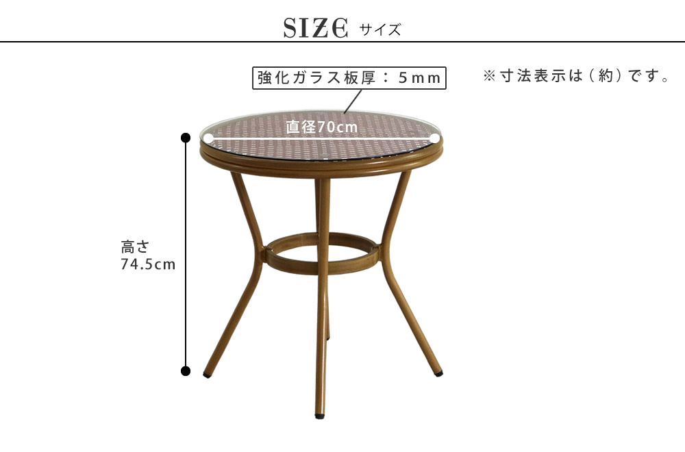 ※北海道・沖縄・離島は別途送料が必要となります。自宅がパリのオープンカフェに。新婚旅行で行ったヨーロッパの街並み。雑誌で見かけた素敵なカフェ。「あの雰囲気を再現するにはどうしたらいいんだろう…」そんな風に考えている方も多いのではないでしょうか?実際に欧米のカフェで使われている「Pleaisir(プレジール)」シリーズは、バイヤーがたまたま休暇で訪れたフランスのニースにあるカフェで、一目ぼれしたものなのです。日本にはなかなかない形とカラーリングは、カフェの本場で長く愛用され、継承されてきた、スタンダードなデザイン。実際に座ってみると、見た目の高級感に反して軽く、急な雨でも水はけ抜群。テラス席に置きっぱなしでも華やかさを保つことができる高い機能性も、長く愛用されてきた理由だとわかるのです。■商品名ラウンドテーブル単品販売「プレジール」■カラー・型番ブラック…PLS-R70-BLKレッド…PLS-R70-RED■サイズ(約)幅 700×奥行 700×高さ 745mm■重量(約)8.7kg■材質 アルミフレーム・PEラタン・強化ガラス ■仕上げ粉体塗装(フレーム部分) ■組立区分組立品 ■組立目安時間2人で20分