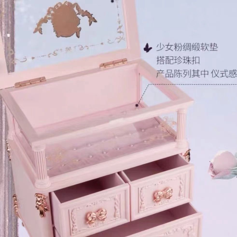 ヨーロッパ式のデザインが取り入れられたピンクベースのメイクボックス。
