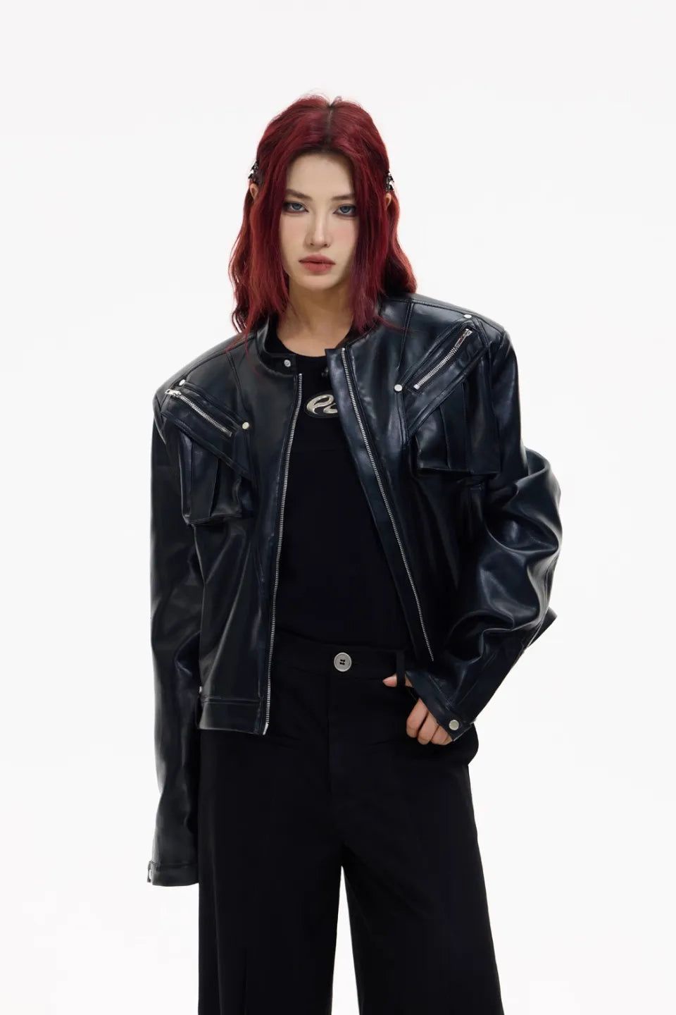 フロントのメタルジップと立体ポケットがデザインの核となり、都会的な存在感を放つ一着。