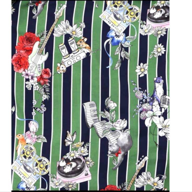 38(グリーン):縦ストライプに、動物や楽器が描かれたどこか懐かしいポップなレトロ柄