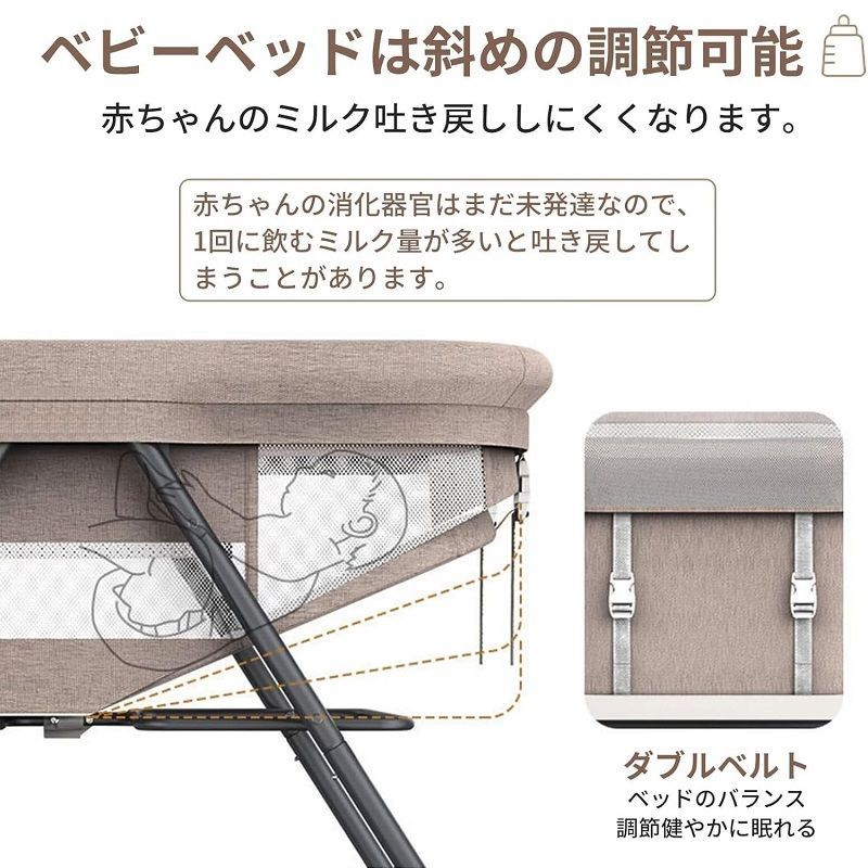アルミ合金を採用しており、軽量でありながら抜群な耐久性!鉄管より強度や耐食性に強いです。ベビーベッドのカバーは肌に優しい、通気性優れる亜麻を採用し、周りのフェンスはメッシュで、横からでも赤ちゃんの様子を確認することができるのでパパママも安心な安全仕様。工具不要で女性一人でも簡単に組み立てることができます。