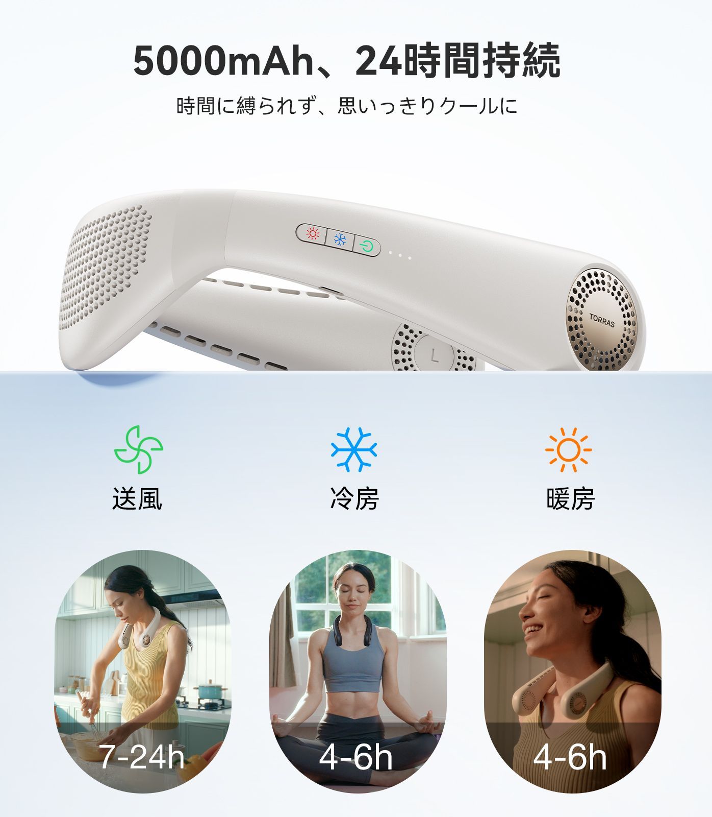 24時間の涼しさ、持続力が劇的に進化。夏の外出でネッククーラーを使うとき、一番の悩みは何?そう、バッテリーがすぐ切れること。Coolify Airネックファンは5000mAhの大容量バッテリーと低消費電力モーターを搭載し、最大24時間もの長時間稼働を実現。サマー・フェスに、庭仕事……短い外出がもちろんラクラク~海辺の旅に、山でのキャンプ……長い外出もいい。10Wの急速充電対応で、充電しながら使えるから、いつでもどこでも涼しさを切り離しません。低消費電力で長時間持続、一日中涼しさをキープ